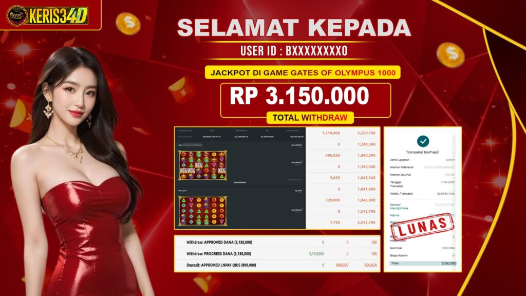 KERIS34D dikenal sebagai situs terpercaya yang selalu menghadirkan pengalaman bermain slot online yang aman, fair, dan berlisensi resmi. Di sini, kami tidak hanya sekadar memberikan janji, tapi bukti nyata berupa slip kemenangan yang dapat Anda lihat secara langsung.