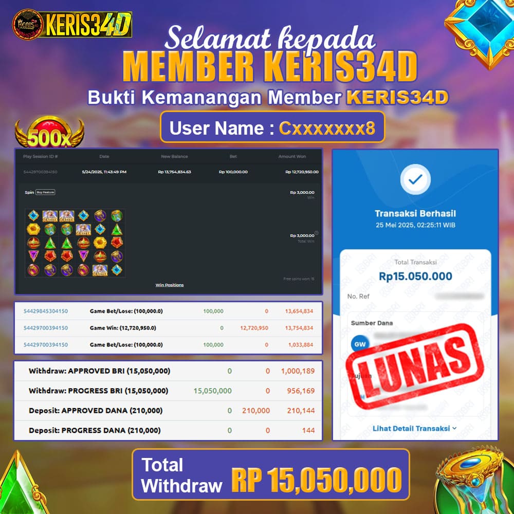 SSetiap hari, member KERIS34D berhasil meraih jackpot besar dari berbagai provider slot ternama yang kami sediakan, seperti Pragmatic Play, Habanero, PG Soft, dan masih banyak lagi. Kami secara rutin menampilkan bukti screenshot atau rekapan kemenangan yang berhasil diraih, mulai dari kemenangan ratusan ribu hingga puluhan juta rupiah. Semua slip kemenangan ini kami hadirkan untuk membuktikan bahwa di KERIS34D, peluang menang itu nyata