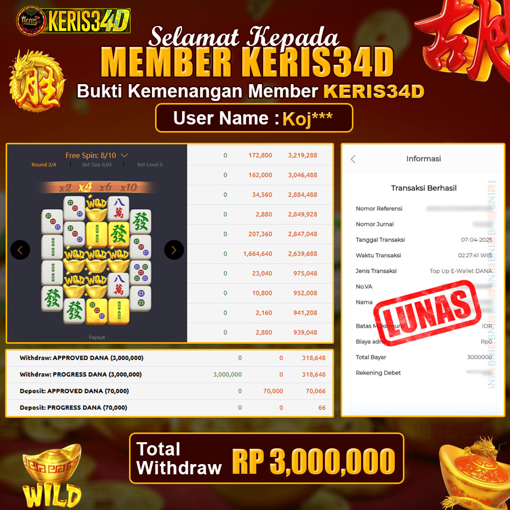 Setiap hari, member KERIS34D berhasil meraih jackpot besar dari berbagai provider slot ternama yang kami sediakan, seperti Pragmatic Play, Habanero, PG Soft, dan masih banyak lagi. Kami secara rutin menampilkan bukti screenshot atau rekapan kemenangan yang berhasil diraih, mulai dari kemenangan ratusan ribu hingga puluhan juta rupiah. Semua slip kemenangan ini kami hadirkan untuk membuktikan bahwa di KERIS34D, peluang menang itu nyata