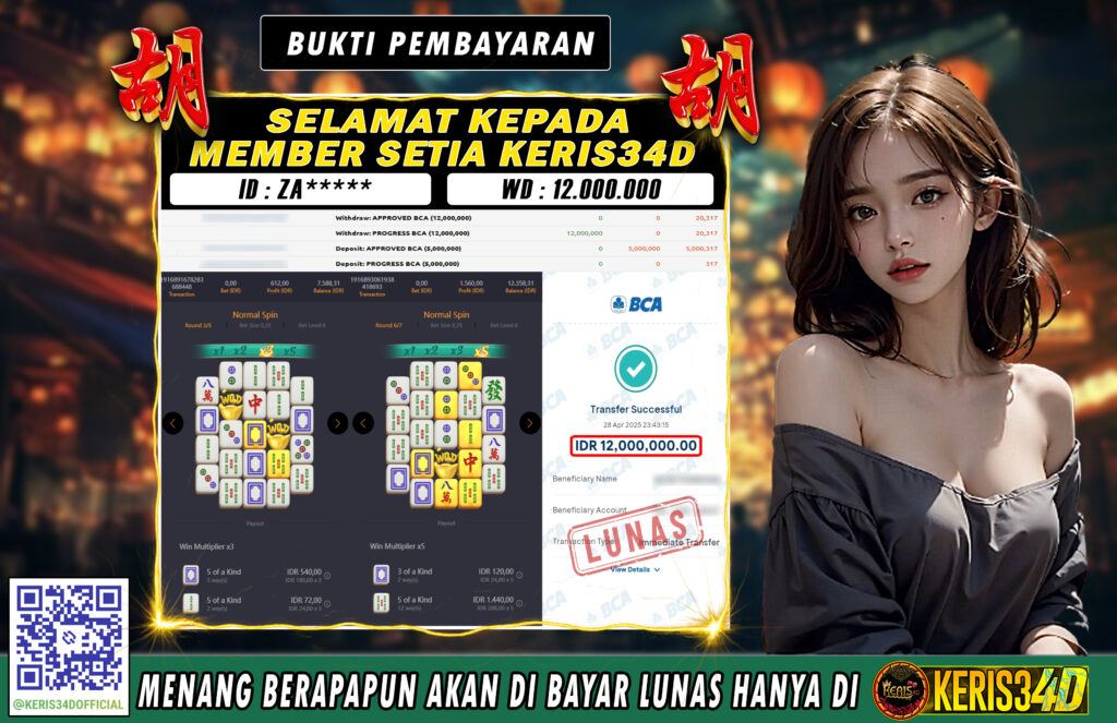 Setiap hari, member KERIS34D berhasil meraih jackpot besar dari berbagai provider slot ternama yang kami sediakan, seperti Pragmatic Play, Habanero, PG Soft, dan masih banyak lagi. Kami secara rutin menampilkan bukti screenshot atau rekapan kemenangan yang berhasil diraih, mulai dari kemenangan ratusan ribu hingga puluhan juta rupiah. Semua slip kemenangan ini kami hadirkan untuk membuktikan bahwa di KERIS34D, peluang menang itu nyata