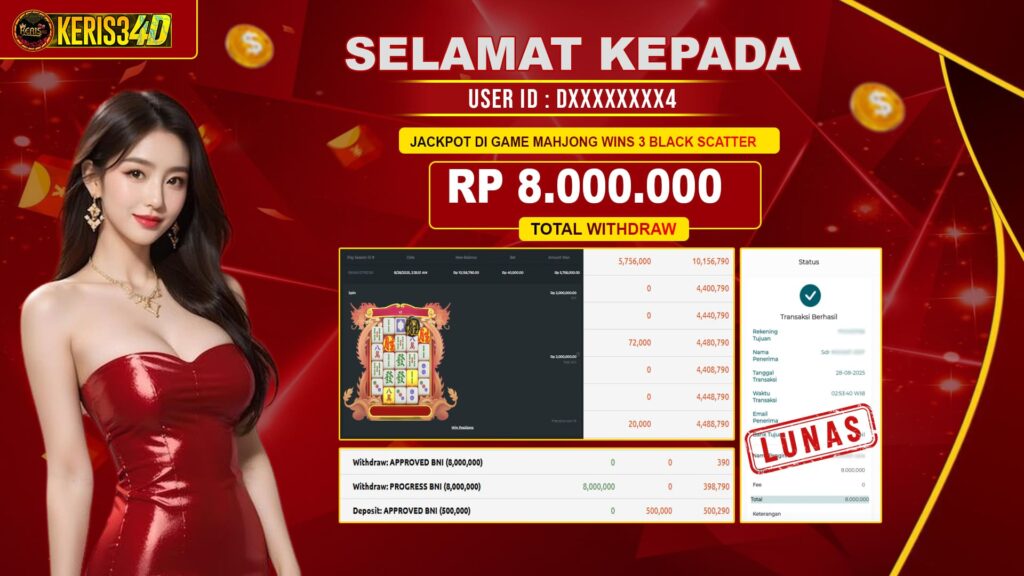 Setiap hari, member KERIS34D berhasil meraih jackpot besar dari berbagai provider slot ternama yang kami sediakan, seperti Pragmatic Play, Habanero, PG Soft, dan masih banyak lagi. Kami secara rutin menampilkan bukti screenshot atau rekapan kemenangan yang berhasil diraih, mulai dari kemenangan ratusan ribu hingga puluhan juta rupiah. Semua slip kemenangan ini kami hadirkan untuk membuktikan bahwa di KERIS34D, peluang menang itu nyata