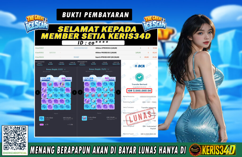KERIS34D dikenal sebagai situs terpercaya yang selalu menghadirkan pengalaman bermain slot online yang aman, fair, dan berlisensi resmi. Di sini, kami tidak hanya sekadar memberikan janji, tapi bukti nyata berupa slip kemenangan yang dapat Anda lihat secara langsung.
