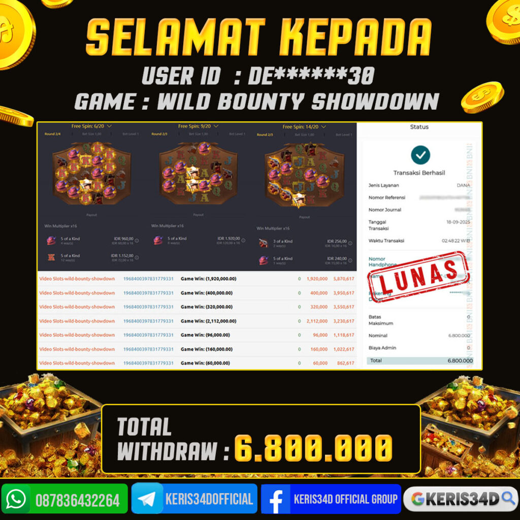 Setiap hari, member KERIS34D berhasil meraih jackpot besar dari berbagai provider slot ternama yang kami sediakan, seperti Pragmatic Play, Habanero, PG Soft, dan masih banyak lagi. Kami secara rutin menampilkan bukti screenshot atau rekapan kemenangan yang berhasil diraih, mulai dari kemenangan ratusan ribu hingga puluhan juta rupiah. Semua slip kemenangan ini kami hadirkan untuk membuktikan bahwa di KERIS34D, peluang menang itu nyata