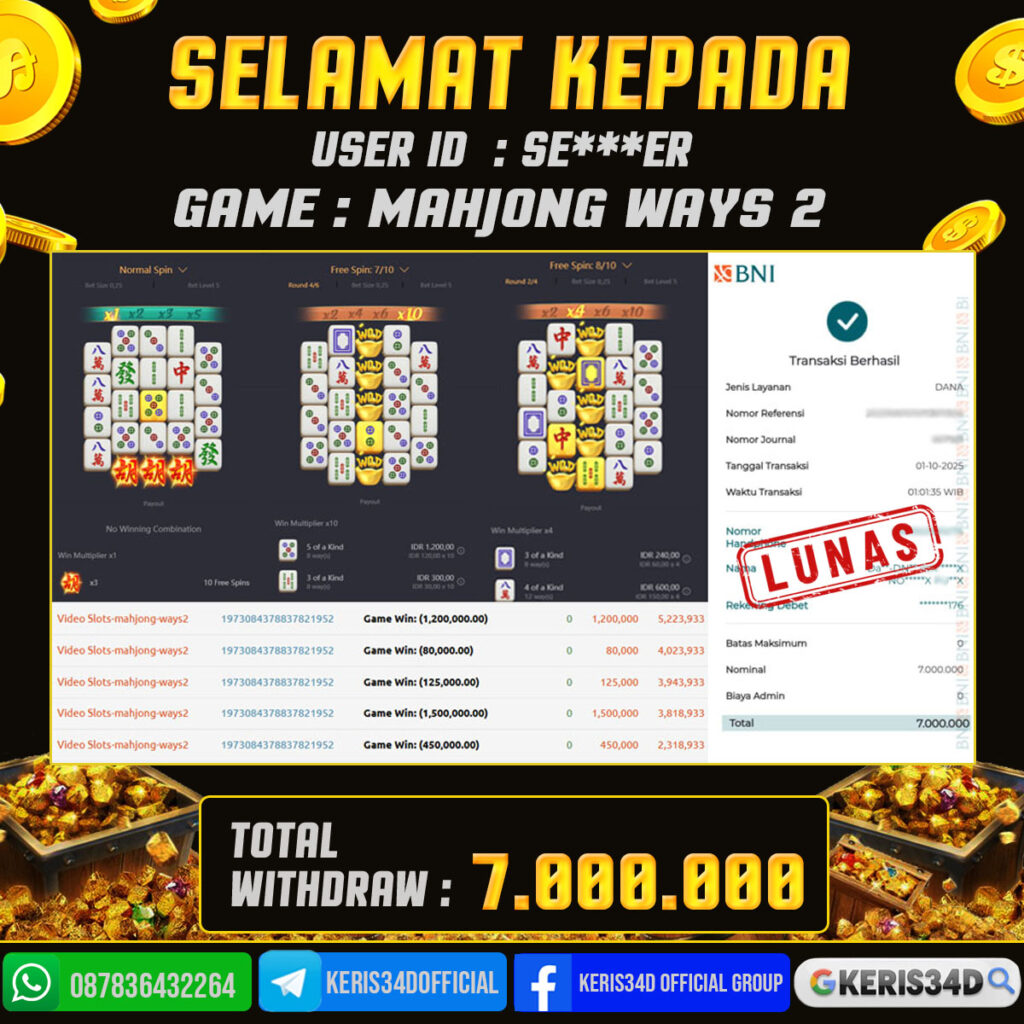 Setiap hari, member KERIS34D berhasil meraih jackpot besar dari berbagai provider slot ternama yang kami sediakan, seperti Pragmatic Play, Habanero, PG Soft, dan masih banyak lagi. Kami secara rutin menampilkan bukti screenshot atau rekapan kemenangan yang berhasil diraih, mulai dari kemenangan ratusan ribu hingga puluhan juta rupiah. Semua slip kemenangan ini kami hadirkan untuk membuktikan bahwa di KERIS34D, peluang menang itu nyata